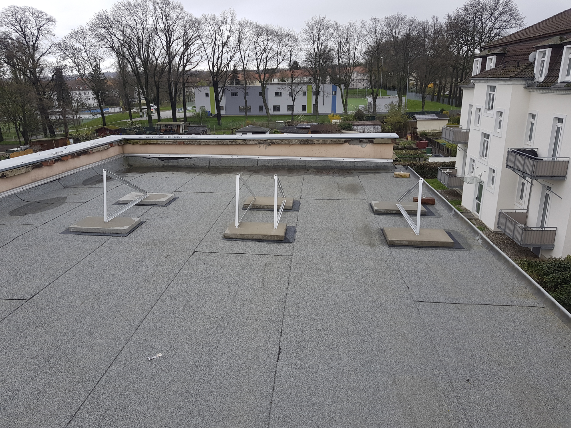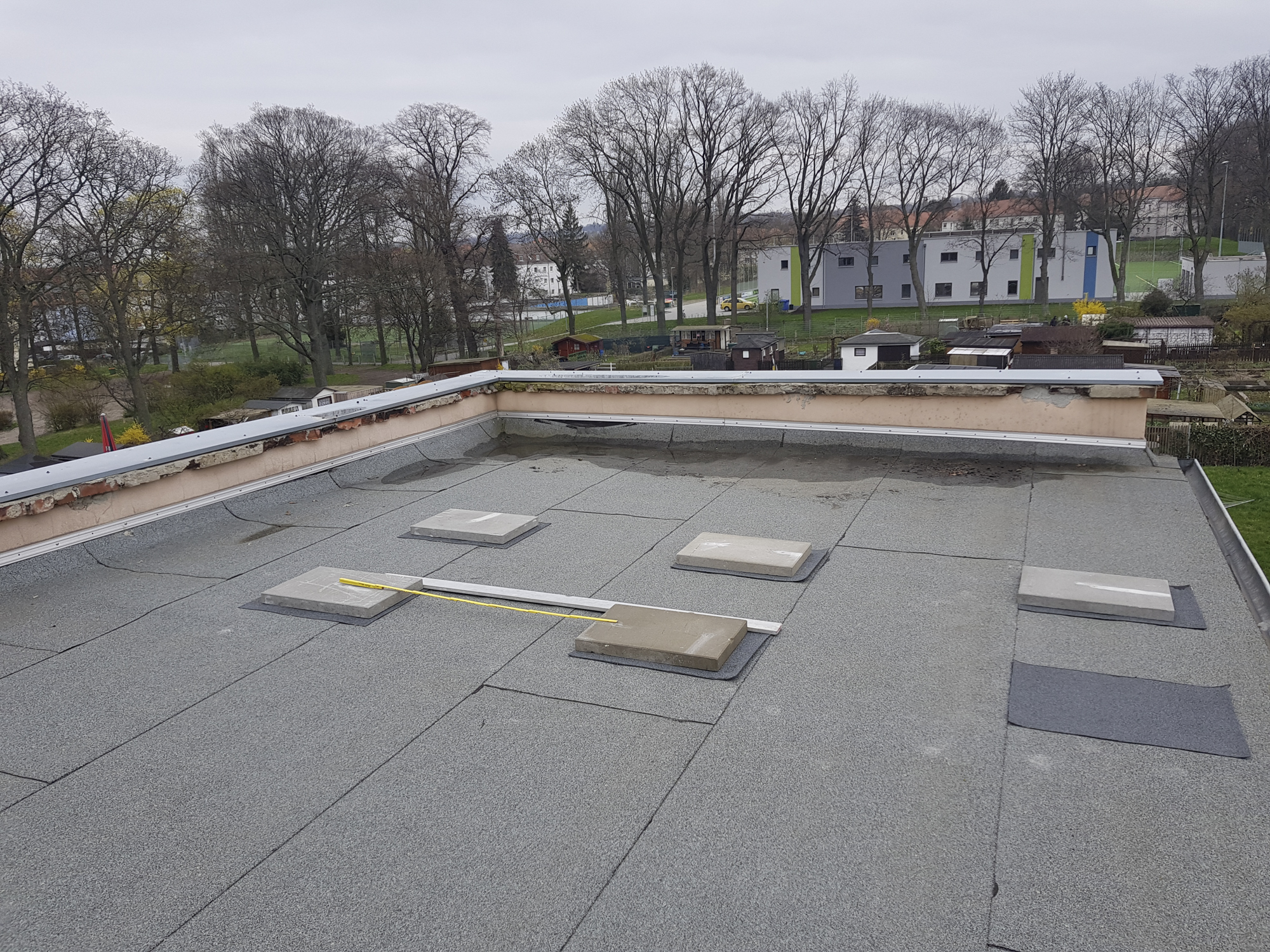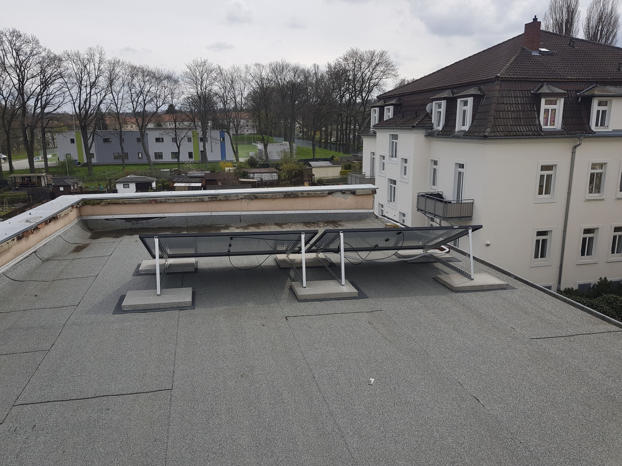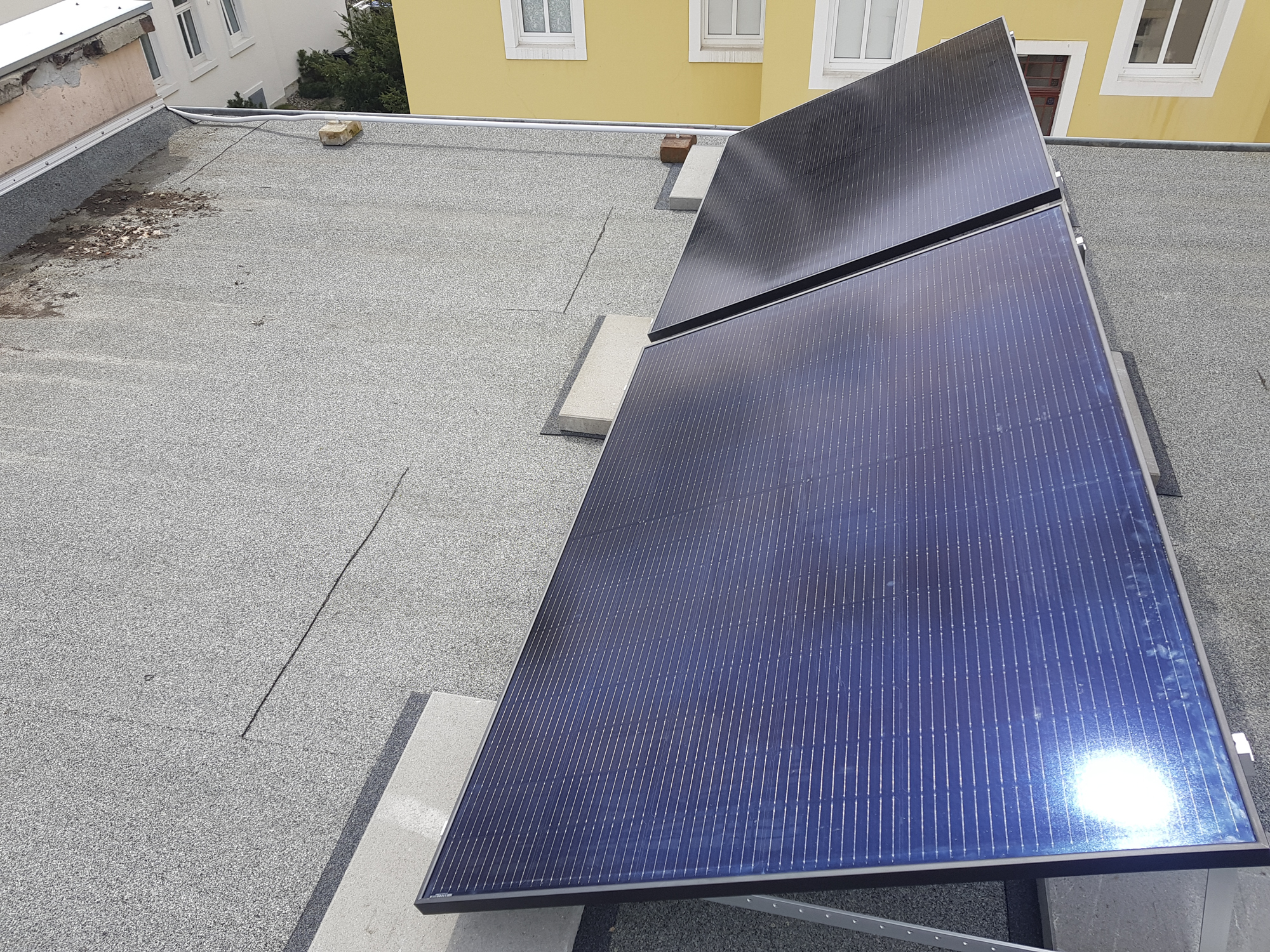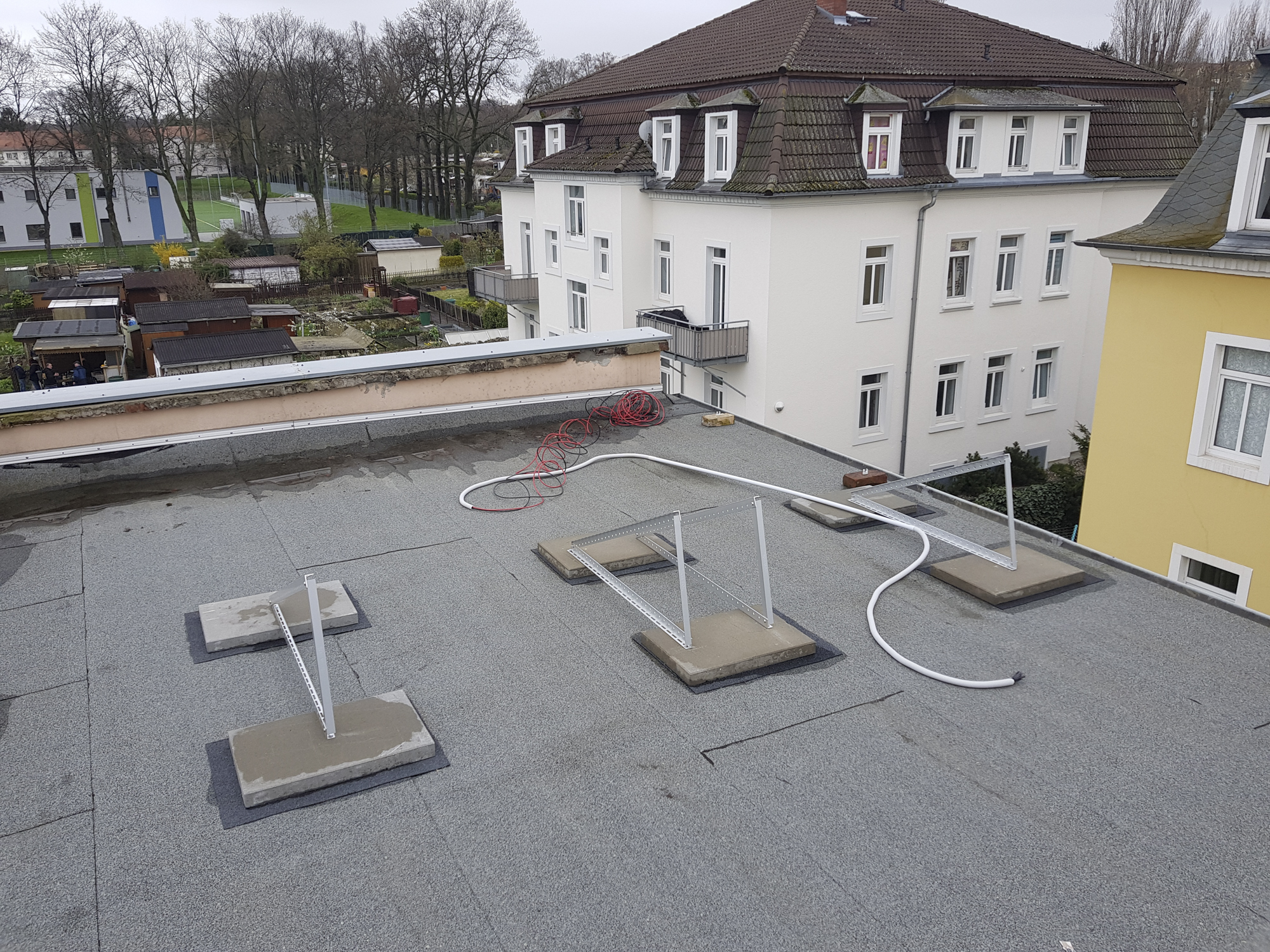 Mit Hilfe einer Aluminium-Aufständerung für PV-Module und Betonplatten zur Beschwerung aus dem Baumarkt habe ich die Module auf dem Dach montiert. Zum Schutz der Bitumen-Schweißbahnen (Dachpappe) habe ich selbstklebende Bitumenbahnen darunter ausgelegt. Mit Dübel und Schraube wurde die Aufständerung mit den Betonplatten verbunden. Bei der Auswahl der Aufständerung kann man mit etwas Recherche Geld sparen - ich habe ca. 40 Euro für eine bezahlt, also insgesamt 80 Euro für beide Solar-Platten.